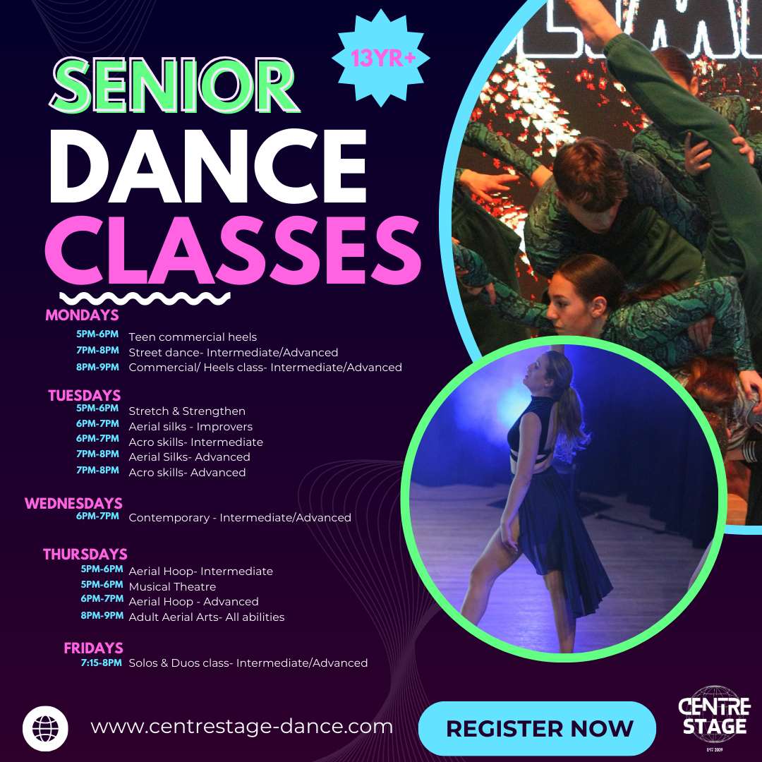 All our classes suitable for dancers from 13 + years old are listed below. To book on, follow the link at the bottom of the page to our Book Your Trial page!